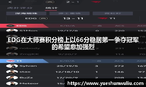 在当前的电子竞技舞台上,EDG战队凭借出色的表现,在大师赛积分榜上以66分稳居第一,成为众多赛事关注的焦点。本文将从多个方面详细分析EDG战队在本次大师赛中的优势,包括其卓越的团队协作、选手个人表现、战术执行能力以及未来展望等。通过对这些方面的探讨,可以更清晰地认识到EDG争夺冠军的希望愈加强烈,为电竞爱好者提供深入而全面的理解。